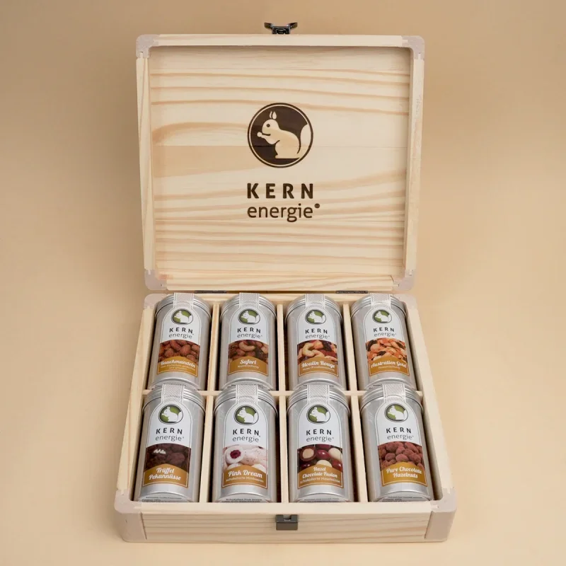 - Acht unterschiedliche Nuss-Spezialitäten in praktischen Dosen