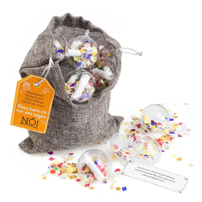 • 15 transparente Kugeln zum Befüllen mit Aufgaben und Rätseln